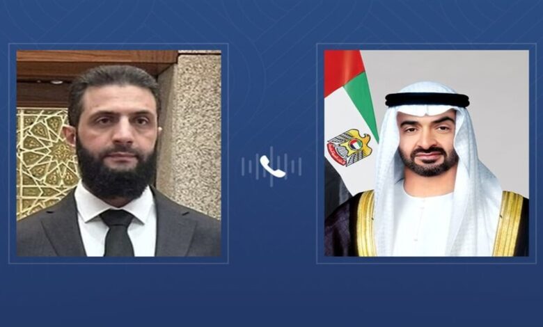 وأفادت وكالة أنباء الإمارات “وام” بأن الشيخ محمد بن زايد تلقى اتصالا هاتفيا من أحمد الشرع، جرى خلاله “بحث سبل تعزيز العلاقات الأخوية بين البلدين الشقيقين في المجالات ذات الاهتمام المشترك”.