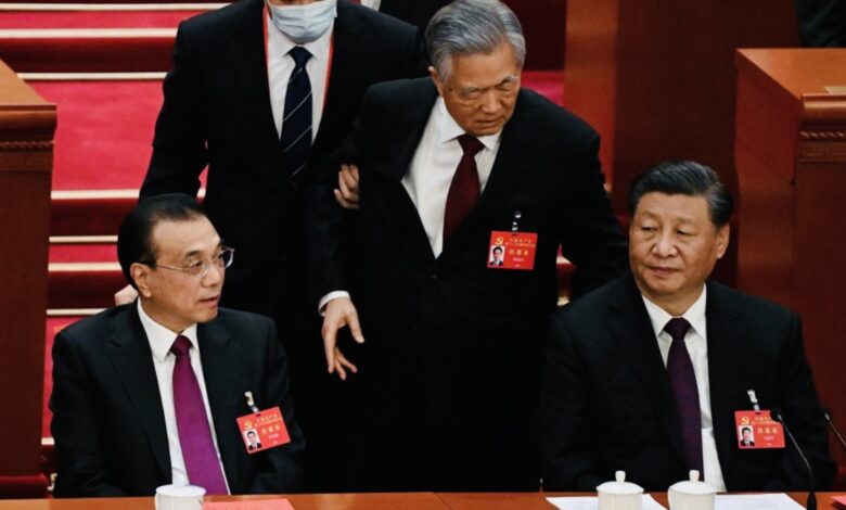 أمام الكاميرات.. إخراج الرئيس الصيني السابق بشكل غريب من مؤتمر الحزب الشيوعي