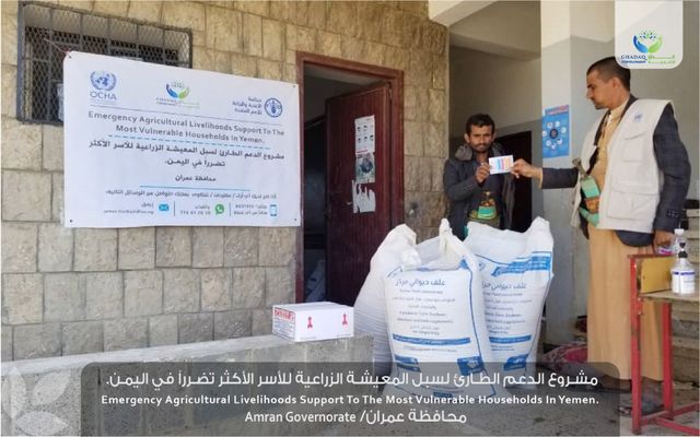 في إطار مشروع دعم سبل المعيشة الزراعية للأسر الأكثر تضررا في اليمن والذي تنفذه منظمة الأغذية والزراعة الفاو بالشراكة مع منظمة غدق للتنمية ..دشنت يوم الخميس 11 نوفمبر 2021 في مديرية القفلة محافظة عمران عملية توزيع كمية من المدخلات الحيوانية والزراعية استهدفت ( 6970 من الاسر الزراعية المستفيدة في مديريات القفلة والعشة و صوير محافظة عمران )