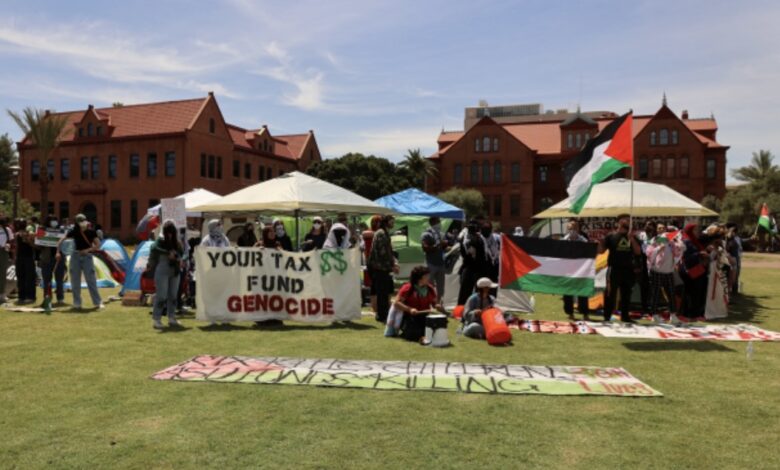 وقالت الجامعة إن “مجموعة من الأشخاص، معظمهم ليسوا من طلاب جامعة ولاية أريزونا أو أعضاء هيئة التدريس أو الموظفين، أقاموا مخيما ونظموا مظاهرة” وتم القبض عليهم ووجهت إليهم تهمة التعدي الجنائي على ممتلكات الغير بعد رفضهم التفرق.