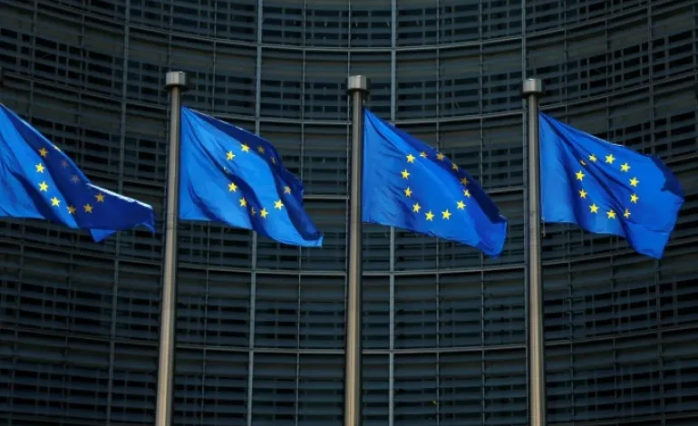أعلام أوروبية أمام مقر الاتحاد الأوروبي ببروكسل (رويترز)