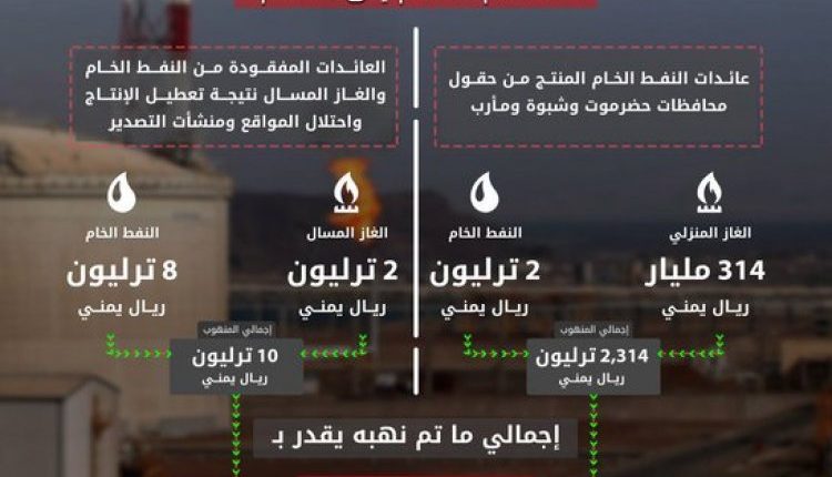 كما تداول انفوجرفيك رسمي صادر عن السلطات في صنعاء يوضح حجم ما تم نهبه على مدى السنوات الماضية من عمر الحرب من عائدات النفط فقط والتي تجاوزت الـ12 تريليون ريال اي ما يعادل صرف مرتبات موظفي الدولة لـ12 عام قادمة.