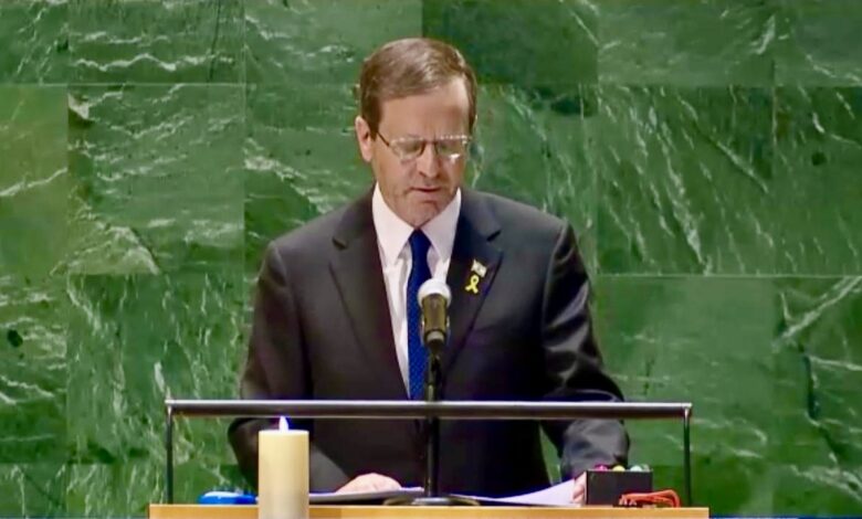 الرئيس الإسرائيلي، إسحاق هرتسوغ بدأ كلمته في الفعالية متحدثا عن الرهائن في غزة. ودعا جميع الممثلين في الجمعية العامة وكل من يعتبر نفسه