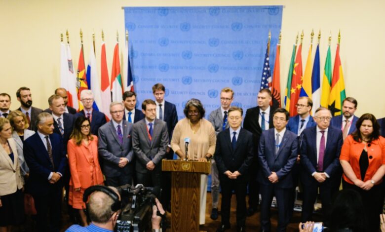محاطة بدبلوماسيين من أكثر من 50 دولة، نددت سفيرة الولايات المتحدة في الأمم المتحدة ليندا توماس-غرينفيلد من مقر الأمم المتحدة في نيويورك في بيان مشترك تلته أمام الصحفيين بـ”انتهاكات حقوق الإنسان والتجاوزات المرتبطة بشكل وثيق بأسلحة الدمار الشامل وتطوير جمهورية كوريا الديموقراطية الشعبية صواريخ بالستية”.