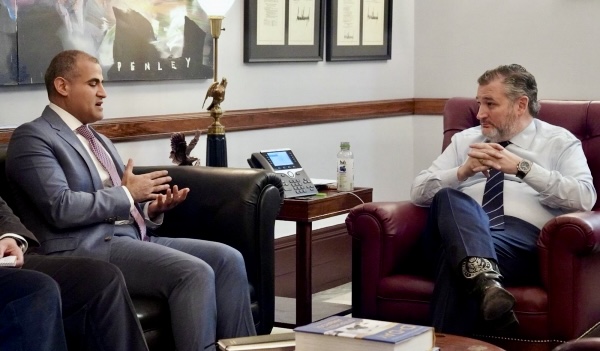 السفير اليمني لدى واشنطن “محمد الحضرمي” خلال لقائه مع السيناتورين “توم تيليس” و “تيد كروز”، “