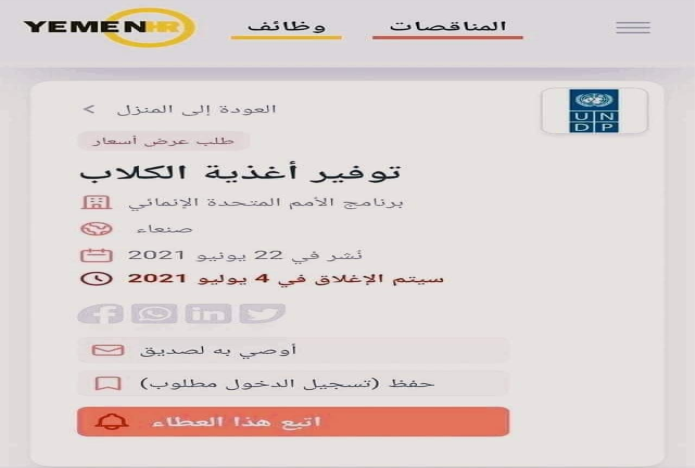 وتداول ناشطين على مواقع التواصل الاجتماعي إعلان عن مناقصة لبرنامج الامم المتحدة الانمائي يتحدث عن فتح مناقصة لتوفير غذاء للكلاب تبدأ من اليوم وينتهي في 4 يوليو المقبل.