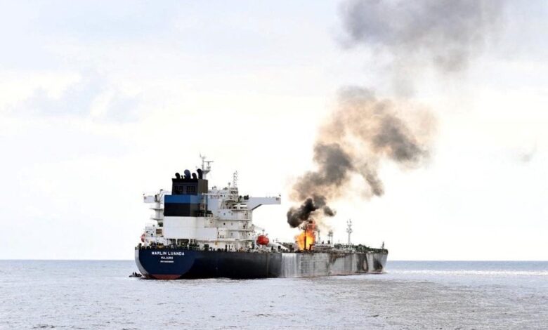 يتصاعد الدخان من السفينة مارلين لواندا، بعد أن أصابها صاروخ حوثي مضاد للسفن في خليج عدن،