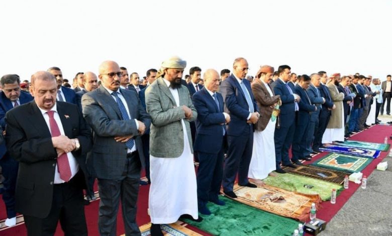 رئيس مجلس القيادة الرئاسي الدكتور رشاد العليمي يؤدي مع نوابه وقيادات الدولة صلاة عيد الفطر في عدن
