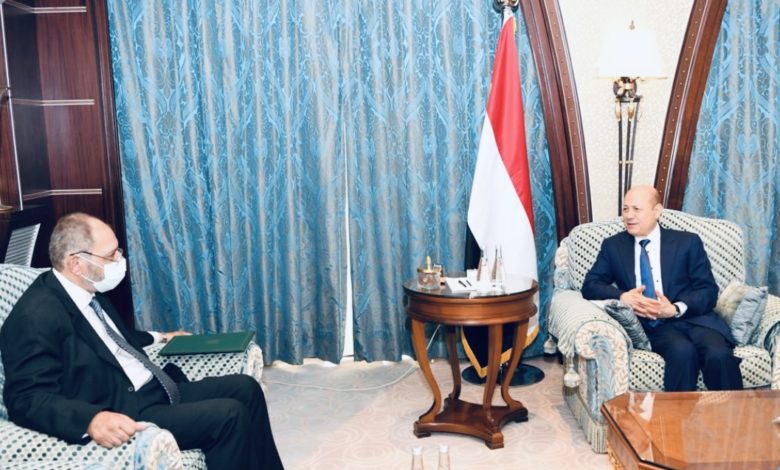 وفي لقائه بالسفير المصري، ناقش العليمي معه، الجهود الأممية والدولية لتنفيذ بنود الهدنة القائمة، وفرص توسيعها.