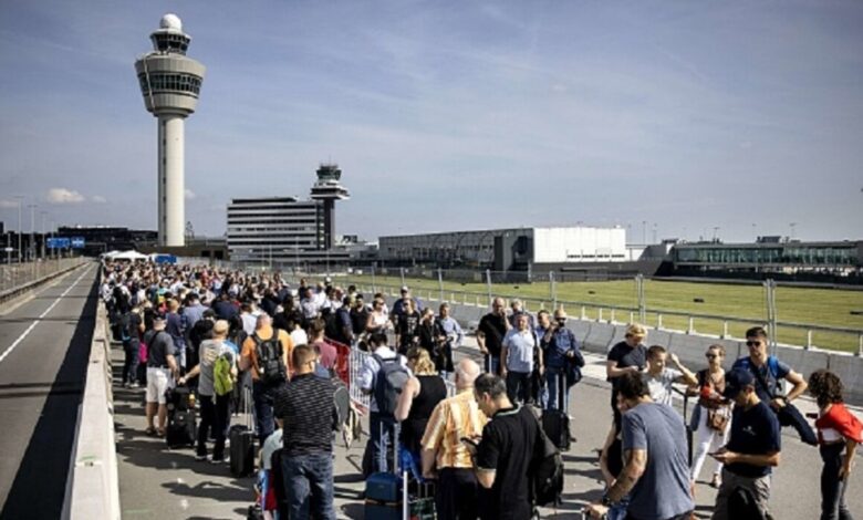 يعيش مطار “سخيبول” في أمستردام فوضى عارمة، حيث تشكلت طوابير طويلة من المسافرين، ونصبت لهم الخيام في الخارج، ناهيك عن ضياع الأمتعة وإضراب الموظفين