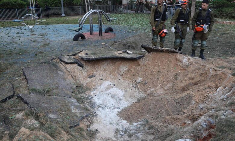 حفرة أحدثها انفجار صاروخ حوثي بالقرب من تل أبيب (أ.ف.ب)