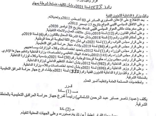 أصدر وكيل وزارة الداخلية للشؤون الفنية ، فرج العبدلي ، قراره رقم ( 332) لسنة 2021م ، و القاضي بإنشاء ضمن الهيكل التنظيمي لجهاز حراسة المرافق التعليمية فرعاً يسمى ( فرع جهاز حراسة المرافق التعليمية بالمنطقة الشرقية ) .