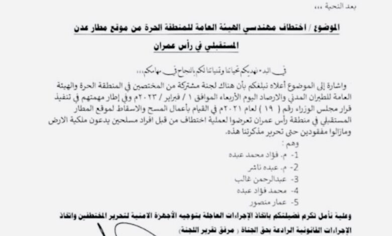 وقال وزير النقل عبدالسلام حُميد، في مذكرة بعثها إلى النائب العام إن مسلحين قاموا (الأربعاء) باختطاف خمسة مهندسين من المنطقة الحرة وهيئة الطيران المدني، أثناء نزولهم إلى منطقة رأس عمران لغرض المسح والاسقاط لموقع مطار عدن المستقبلي.