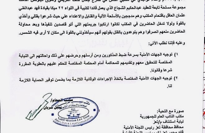 وطلب البلاغ من النائب العام للجمهورية ونيابة استئناف تعز ومحافظ المحافظة بتوجيه الأجهزة الأمنية بسرعة ضبط المذكورين ومن أرسلهم وحرضهم على ذلك. وإحالتهم إلى النيابة المتخصصة للتحقيق معهم وتقديمهم للمحاكمة أمام المحكمة المختصة للحكم عليهم بالعقوبة المقررة شرعا وقانونا.