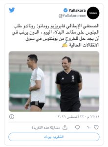 وكتب الصحفي الإيطالي، فابرزيو رومانو، المتخصص في سوق الانتقالات بالشبكة، “تغريدة” عبر حسابه الشخصي على موقع “تويتر” اشار فيها إلى أن رونالدو طلب الجلوس على مقاعد البدلاء اليوم، لأن الدون يرغب في إيجاد حل للخروج من يوفنتوس في سوق الانتقالات الحالية، وحتى الآن لم يتلق نادي يوفنتوس أي عروض للتعاقد مع البرتغالي في الميركاتو الصيفي الحالي.