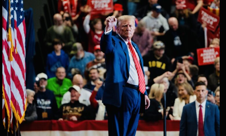 ودون التعليق بشأن هجوم أنصاره على الكابيتول في 6 يناير 2021، وصل ترامب، الجمعة، إلى ولاية آيوا حيث ألقى كلمة في تجمع انتخابي في مدينة نيوتن ثم ألقى خطابا في مدرسة بمدينة كلينتون على الحدود مع ولاية إيلينوي.