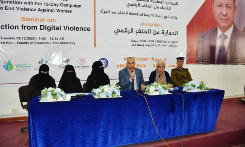 نظّمت المبادرة الوطنية المشتركة للحماية من العنف الرقمي، وبقيادة ست جهات تقودها نساء، ندوة توعوية في جامعة تعز ، وذلك تزامنًا مع حملة الـ16 يومًا لمناهضة العنف ضد المرأة، وبرعاية الأستاذ الدكتور محمد الشعيبي رئيس الجامعة، وبالتنسيق مع نيابة شؤون الطلبة وكلية التربية.