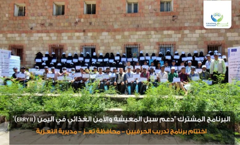 اختتمت منظمة العمل الدولية وشريكها المحلي منظمة غدق للتنمية الاثنين الموافق 11اكتوبر 2021م  في مديرية التعزية – محافظة تعز أنشطة الدورة التدريبة الخاصة بتدريب الحرفيين والتي تندرج ضمن برنامج دعم سبل المعيشة والأمن الغذائي في اليمن “الصمود2” في إطار برنامج التلمذة المهنية الممول من “الاتحاد الأوروبي و SIDA ” .