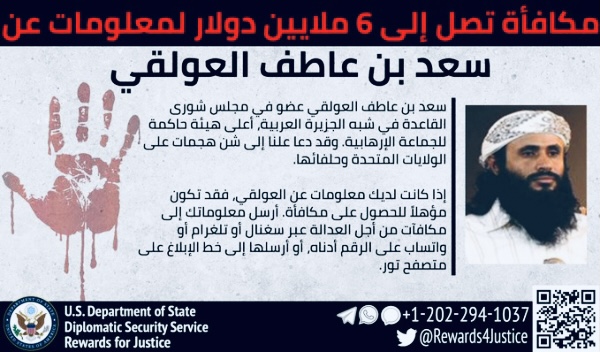 وقال البيان الصادر عن برنامج “مكافآت من أجل العدالة”، التابع لوزارة الخارجية الأمريكية، نشره عبر حسابه بموقع “توتير”: “تقدم مؤسسة مكافآت العدالة ما يصل إلى 6 ملايين دولار للحصول على معلومات تؤدي إلى تحديد هوية أو موقع سعد بن عاطف العولقي”.