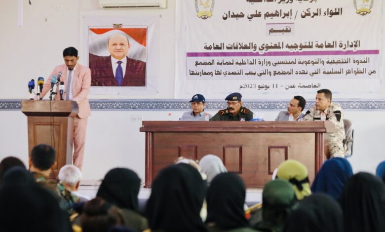 نظمت وزارة الداخلية ممثلة بالإدارة العامة للتوجيه المعنوي والعلاقات العامة، اليوم، في العاصمة المؤقتة عدن، ندوة توعوية وتثقيفية لمنتسبي الوزارة حول حماية المجتمع من الظواهر السلبية الدخيلة التي تهدد المجتمع وتستوجب توحيد الصفوف والجهود للتصدي لتلك الظواهر ومحاربتها والقضاء عليها، وذلك برعاية وزير الداخلية اللواء الركن إبراهيم حيدان.