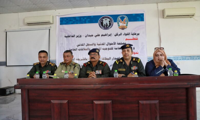 وناقشت الندوة،التي حضرها وكيلا وزارة الداخلية لقطاع الأمن والشرطة اللواء الركن محمد مساعد الأمير ، واللواء الركن عبدالماجد العامري برك العامري وكيل قطاع الخدمات المدنية، ورئيس مصلحة الأحوال المدنية والسجل المدني اللواء سند جميل محمد ومدير عام التوجيه المعنوي والعلاقات العامة بوزارة الداخلية العميد عبدالقوي باعش،ورؤساء ووكلاء ومدراء عموم المصالح التابعة للوزارة وقيادات عسكرية وأمنية بوزارة الدفاع واللجنة العسكرية والأمنية العليا والجهات ذات العلاقة ورؤساء تحرير الصحف الرسمية والمحلية وممثلي منظمات المجتمع المدني.