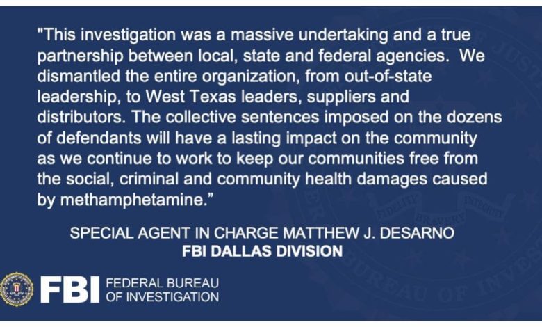 “This investigation was a massive undertaking and a true partnership between local, state and federal agencies. We dismantled the entire organization, from out-of-state leadership, to West Texas leaders, suppliers and distributors,” said FBI Dallas Special Agent in Charge Matthew J. DeSarno. “The collective sentences imposed on the dozens of defendants will have a lasting impact on the community as we continue to work to keep our communities free from the social, criminal and community health damages caused by methamphetamine.”