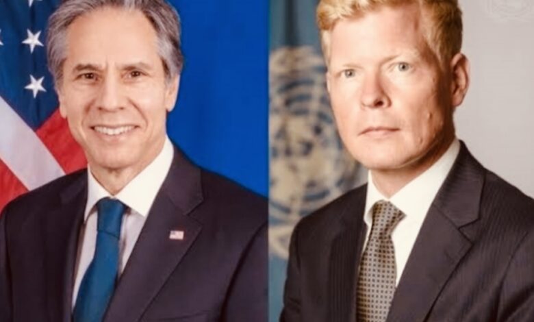 ناقش المبعوث الأممي الخاص إلى اليمن هانس غروندبرغ، مع وزير الخارجية الأمريكي أنتوني بلينكن، بشأن “الجهود الرامية للتوصل إلى اتفاق شامل بين الأطراف اليمنية”. وقال مكتب المبعوث الأممي، في بيان أصدره اليوم الاربعاء، إن غروندبرغ، التقى في واشنطن بوزير الخارجية الأمريكي أنتوني بلينكن وعدد من كبار المسؤولين الأمريكيين. وأضاف أن اللقاء ناقش التقدم المحرز في الجهود الرامية للتوصل إلى اتفاق بين الأطراف اليمنية بشأن تدابير لتحسين ظروف المعيشة في اليمن، ووقف إطلاق نار مستدام في جميع أنحاء البلاد، واستئناف عملية سياسية جامعة في اليمن برعاية الأمم المتحدة. وقال غروندبرغ، أن وساطة الأمم المتحدة لجمع اليمنيين من أجل تحقيق السلام المستدام تتطلب دعمًا إقليميًا ودوليًا متضافرًا. وأشار إلى الحاجة للحفاظ على التوافق والوحدة بين أعضاء مجلس الأمن والمجتمع الدولي على طول مسار اليمن نحو السلام والتعافي والتنمية.