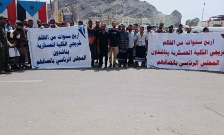 المشاركون في الوقفة الاحتجاجية رفعوا لافتات، كُتب عليها: “أربع سنواتٍ من الظلم.. خريجو الكلية العسكرية يناشدون المجلس الرئاسي إنصافهم”.