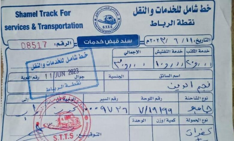 وسخرت من سندات القبض التي تحمل عنوان “خط شامل للخدمات والنقل” دون أن تتبع جهة رسمية سوى انها تفرض مبالغ مالية على الشاحنات المغادرة عدن باتجاه المحافظات الشمالية.