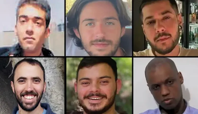 الصورة، الرهائن الستة المقرر الإفراج عنهم السبت: في الأعلى من اليمين: (إيليا كوهين، عمر شيم توف، هشام السيد)، في الأسفل من اليمين: (أفرا منجيستو، عمر فانكرت، وتال شوهام)