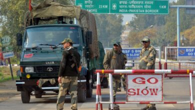 يقف أفراد من قوة أمن الحدود الهندية حراسًا عند معبر واجاه الحدودي بين الهند وباكستان، بالقرب من أمريتسار، في 26…