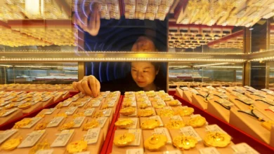بائعة ترتب مجوهرات ذهبية معروضة للبيع في متجر بمدينة ليانيونغانغ بمقاطعة جيانغسو شرق الصين (أ.ف.ب) عين اليمن الحر –…