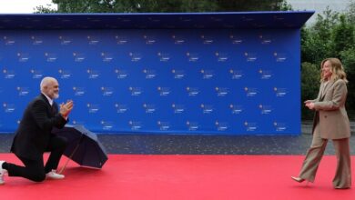 رئيس وزراء ألبانيا يركع تحت المطر لأقصر زعيمة أوروبية! (فيديو)