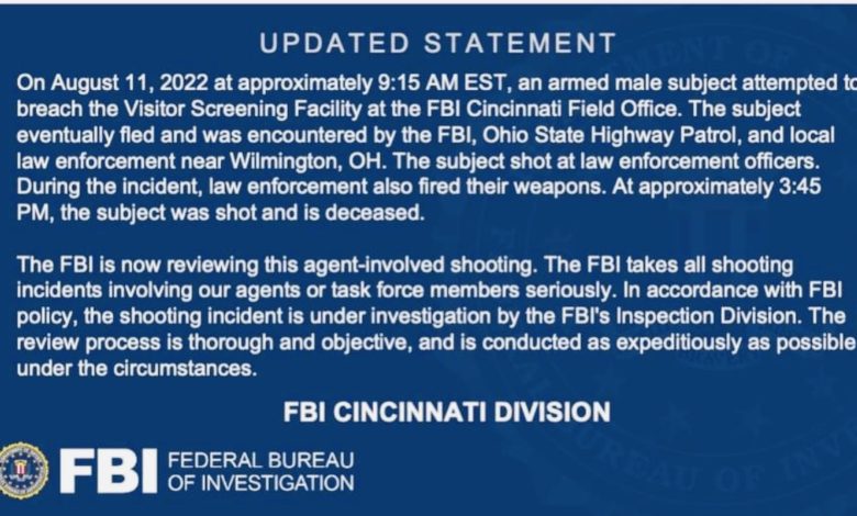 On August 11, 2022 at approximately 9:15 AM EST, an armed male subject attempted to breach the Visitor Screening Facility at the FBI Cincinnati Field Office. The subject eventually fled and was encountered by the FBI, Ohio State Highway Patrol, and local law enforcement near Wilmington, OH. The subject shot at law enforcement officers. During the incident, law enforcement also fired their weapons. At approximately 3:45 PM, the subject was shot and is deceased.