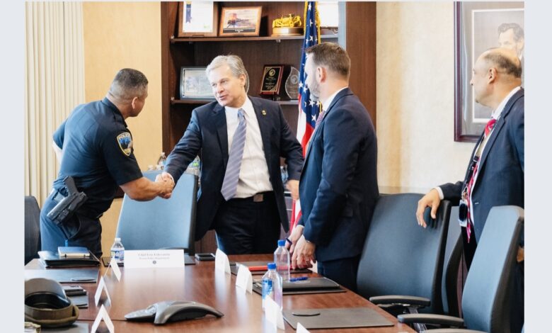 FBI Director Christopher Wray met with state, local, and federal law enforcement personnel during his August 8, 2023, visit to the FBI Springfield Field Office