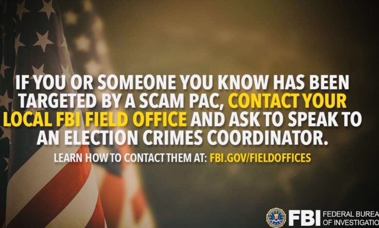 If you or someone you know has been targeted by a scam PAC, contact your local FBI field office and ask to speak to an election crimes coordinator.