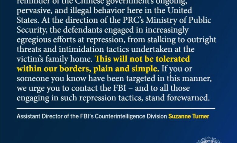 “The defendants engaged in a campaign of harassment and coercion on behalf of the PRC to force the victim’s repatriation to China from the United States, including by threatening family members,” said Assistant Attorney General Matthew G. Olsen of the Justice Department’s National Security Division. “The Department of Justice will hold accountable those who would help repressive regimes violate the fundamental freedoms of people in the United States.”