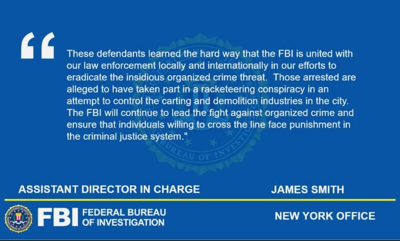 “These defendants learned the hard way that the FBI is united with our law enforcement locally and internationally in our efforts to eradicate the insidious organized crime threat. Those arrested are alleged to have taken part in a racketeering conspiracy in an attempt to control the carting and demolition industries in the city. The FBI will continue to lead the fight against organized crime and ensure that individuals willing to cross the line face punishment in the criminal justice system” stated FBI Assistant Director-in-Charge Smith.
