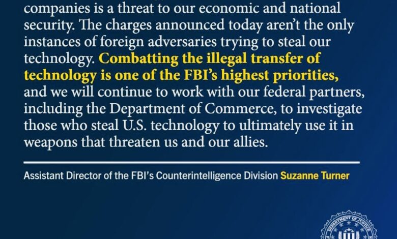“The theft of technology and trade secrets from U.S. companies is a threat to our economic and national security,” said Assistant Director Suzanne Turner of the FBI’s Counterintelligence Division. “The charges announced today aren’t the only instances of foreign adversaries trying to steal our technology. Combating the illegal transfer of technology is one of the FBI’s highest priorities, and we will continue to work with our federal partners, including the Department of Commerce, to investigate those who steal U.S. technology to ultimately use it in weapons that threaten us and our allies.”